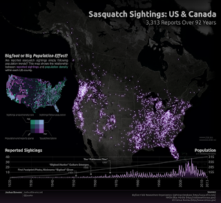 And while we have extremely talented people making awesome graphs, like the one below, no one seems to be able to appropriately compile and decipher the data. The maker of this chart indicates that there should be more sightings the higher the population in the area- but I disagree. If the sasquatch is as elusive as he has proven (and not just a mythological creature), they would be smart enough to stay away from the densely populated areas and keep to himself where there aren't many other humans.